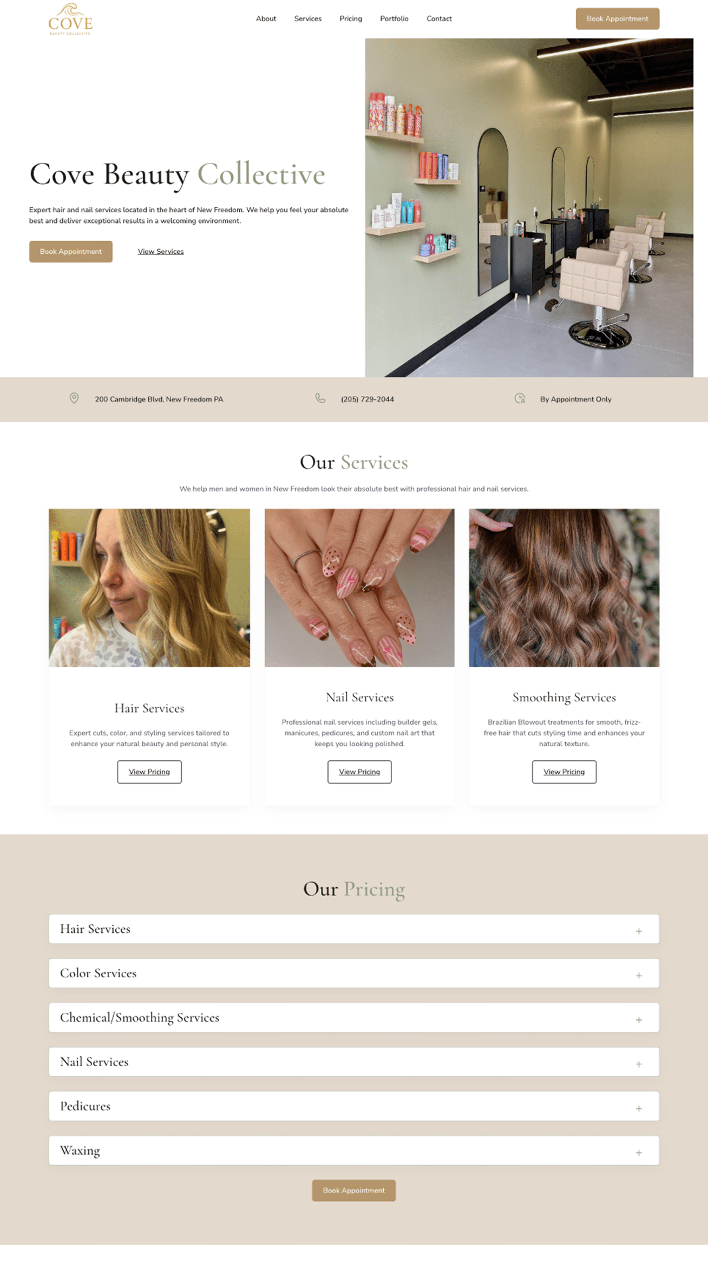 Cove Beauty Collective is a modern salon and beauty collective based in Chambersburg, Pennsylvania, offering hair services, skincare treatments, and a curated selection of independent beauty professionals under one roof. When they approached Noble Digital, they needed a sophisticated online presence that reflected their upscale brand and made it easy for clients to discover their services and book appointments.